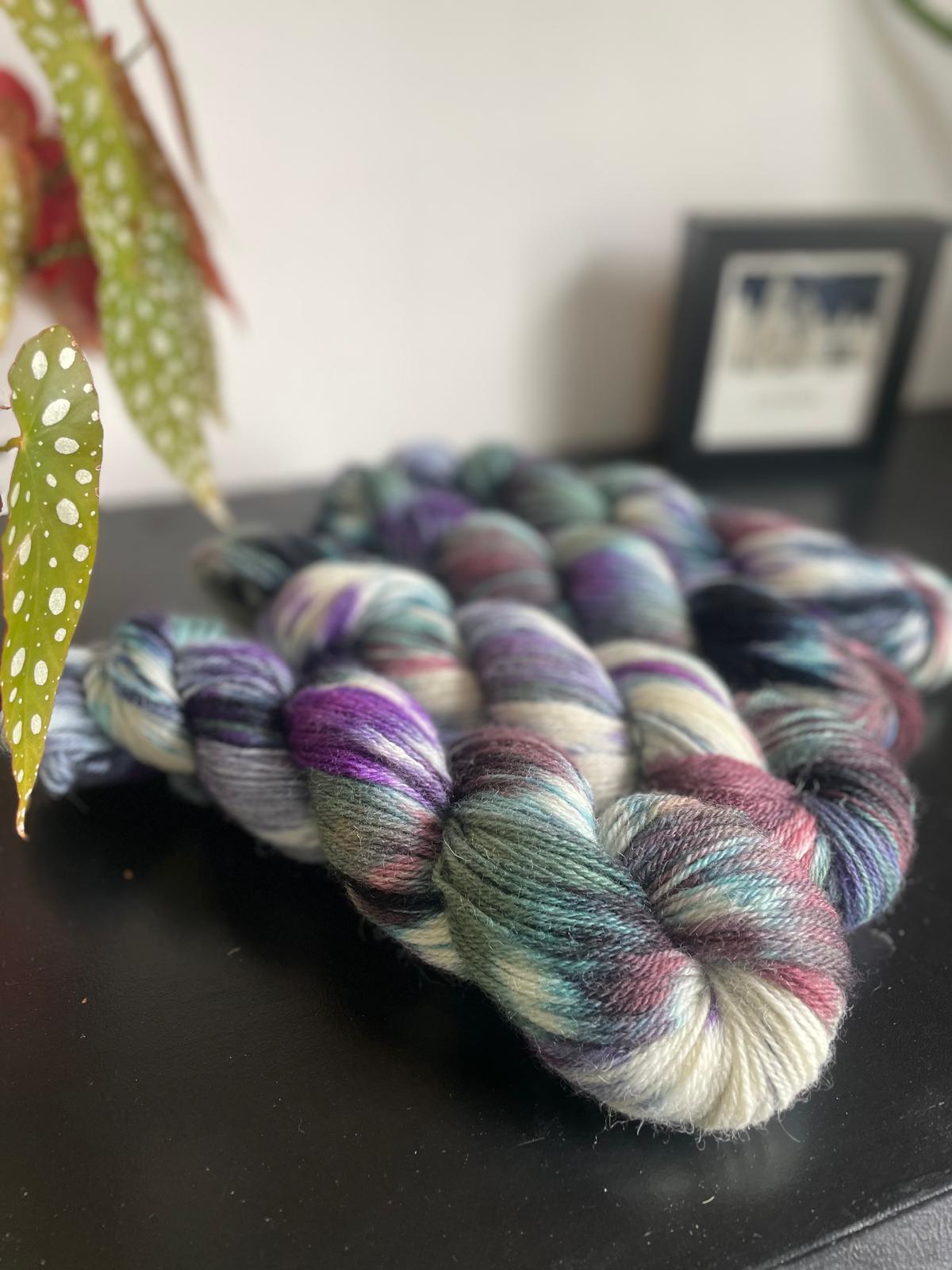 Inspired by the spectacular Scottish highlands this beautiful hand dyed yarn includes splashes of purple, green, brown and grey.