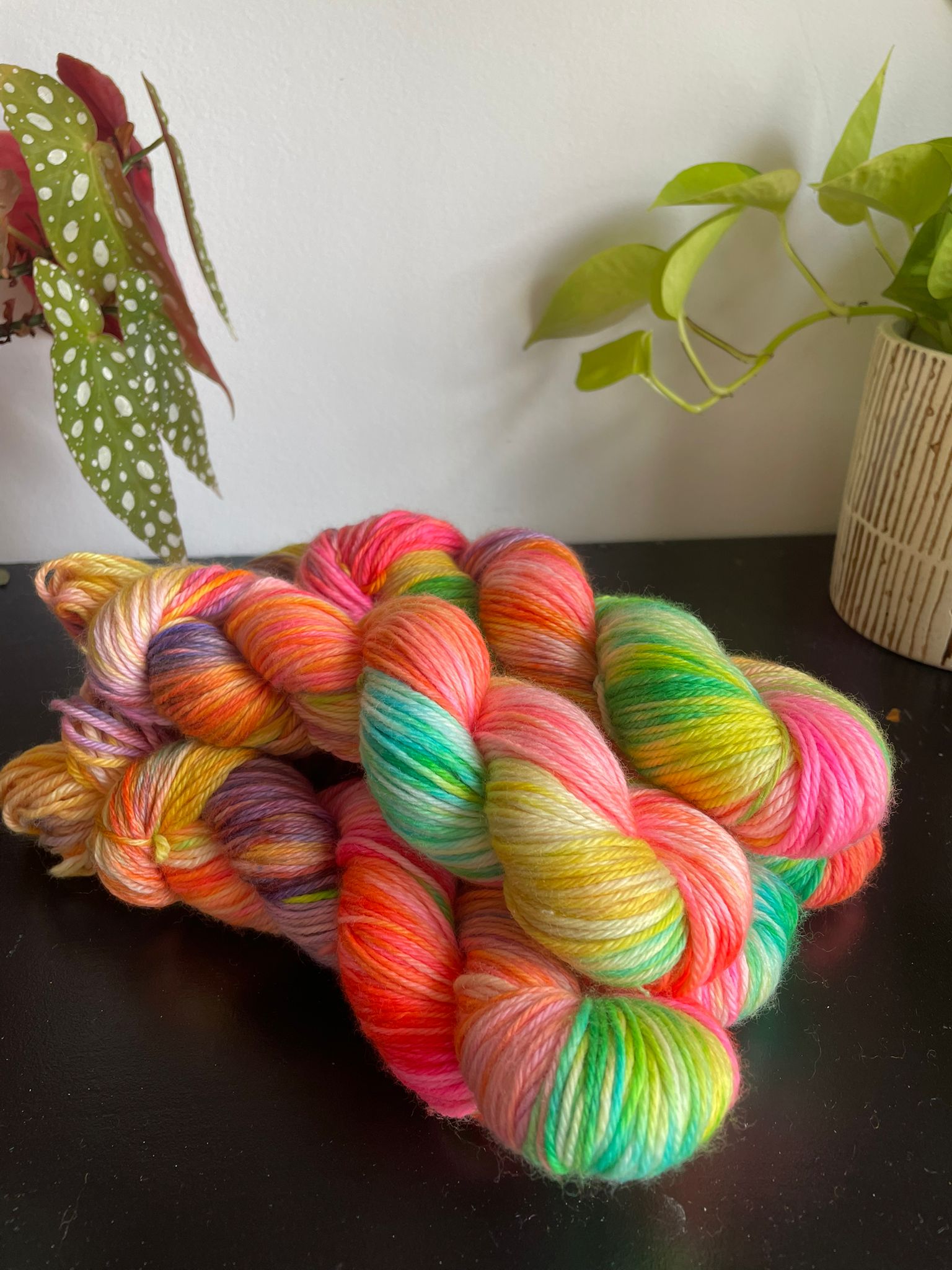 Inspired by the refreshing ice lollies you enjoy in the sunshine this beautiful hand dyed yarn includes shades of green, pink, purple, yellow and orange. This is a wonderfully soft yarn.