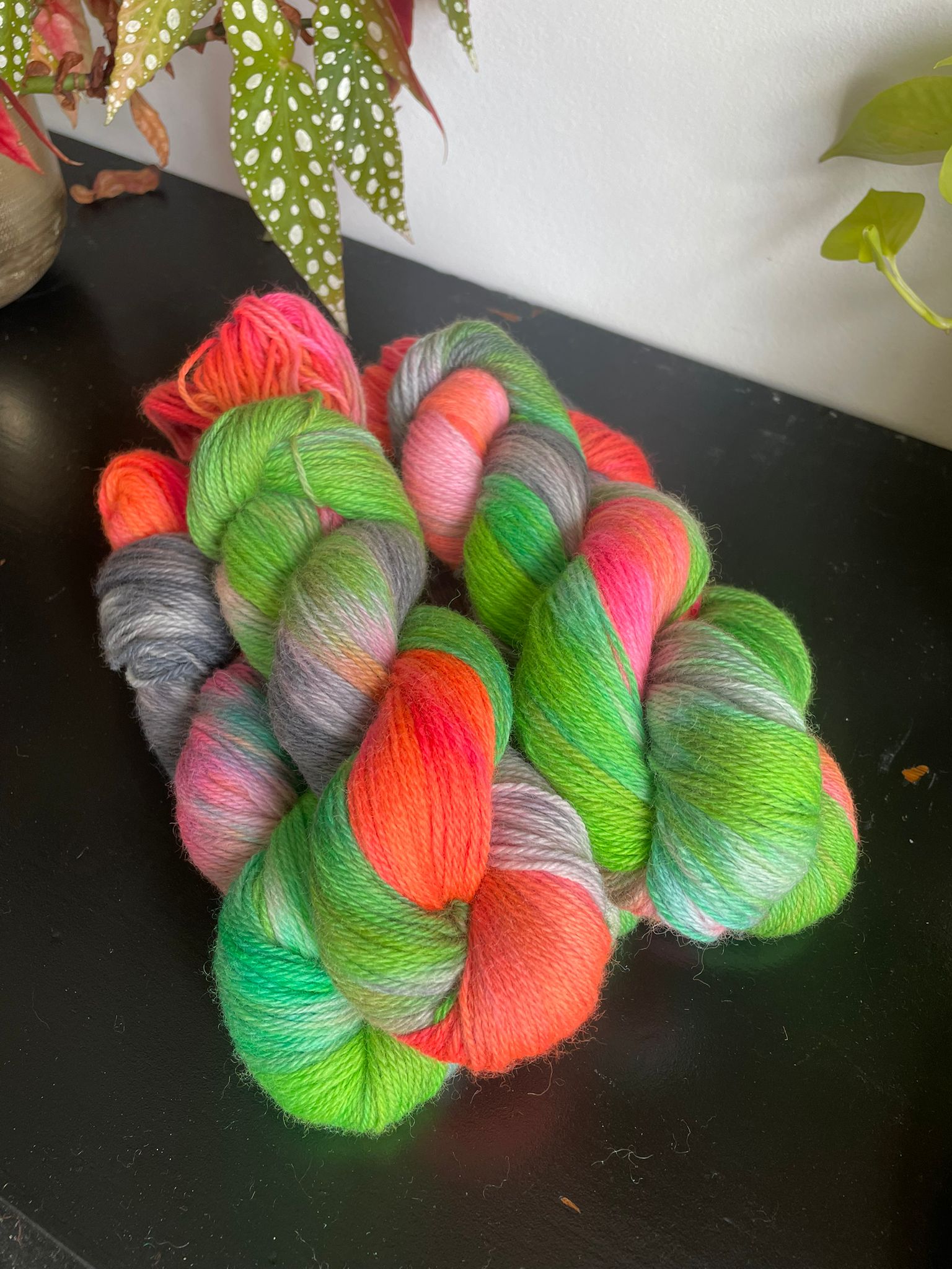 Inspired by an enchanting mermaid, this beautiful hand dyed yarn includes shades of coral, pink, green and grey.