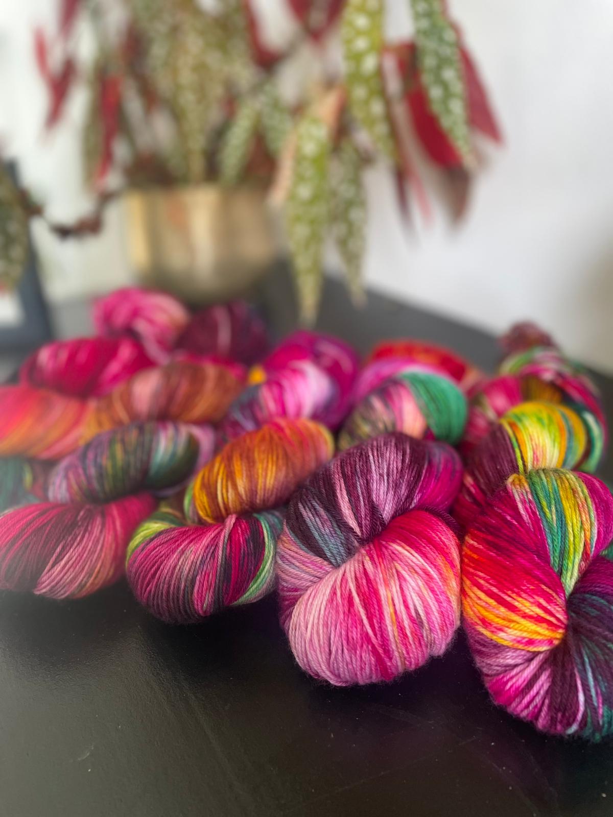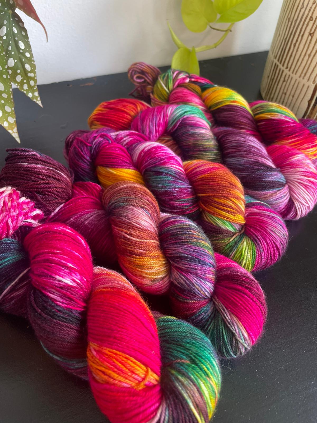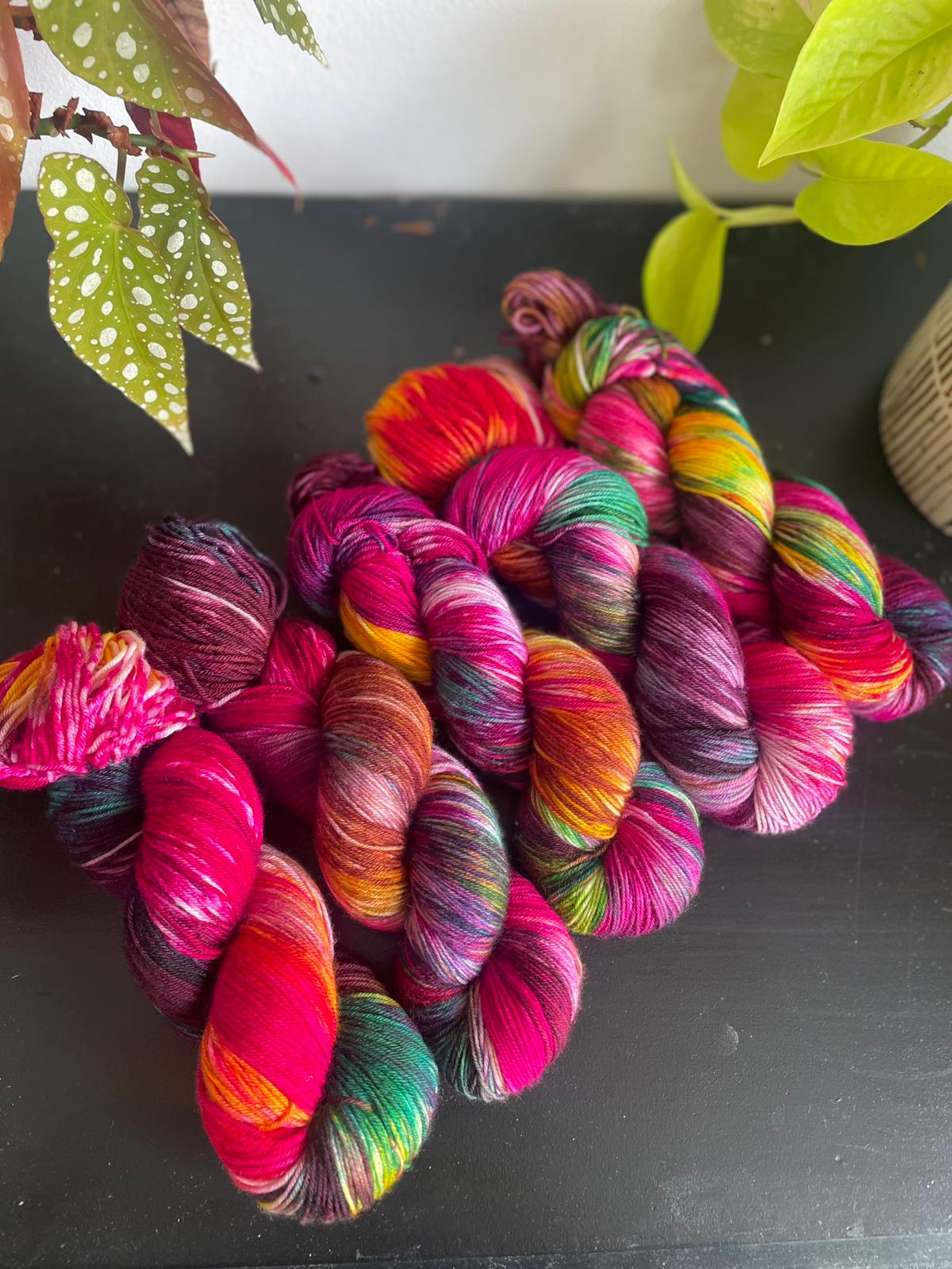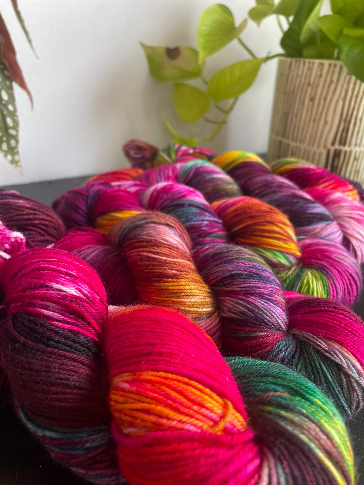 Inspired by the exploding colours of Nebula this beautiful hand dyed yarn includes shades of red, pink, yellow, green, purple and brown.
