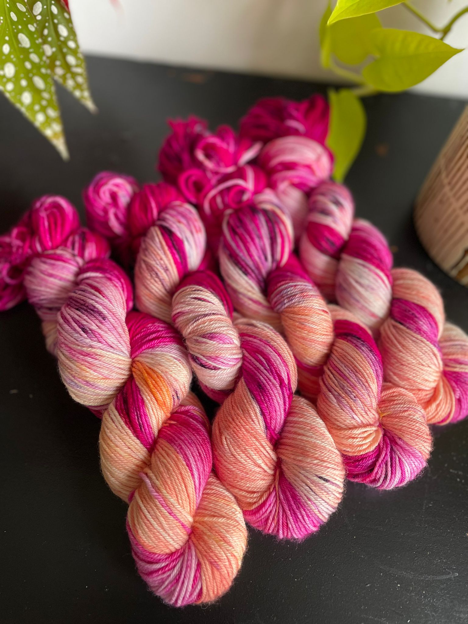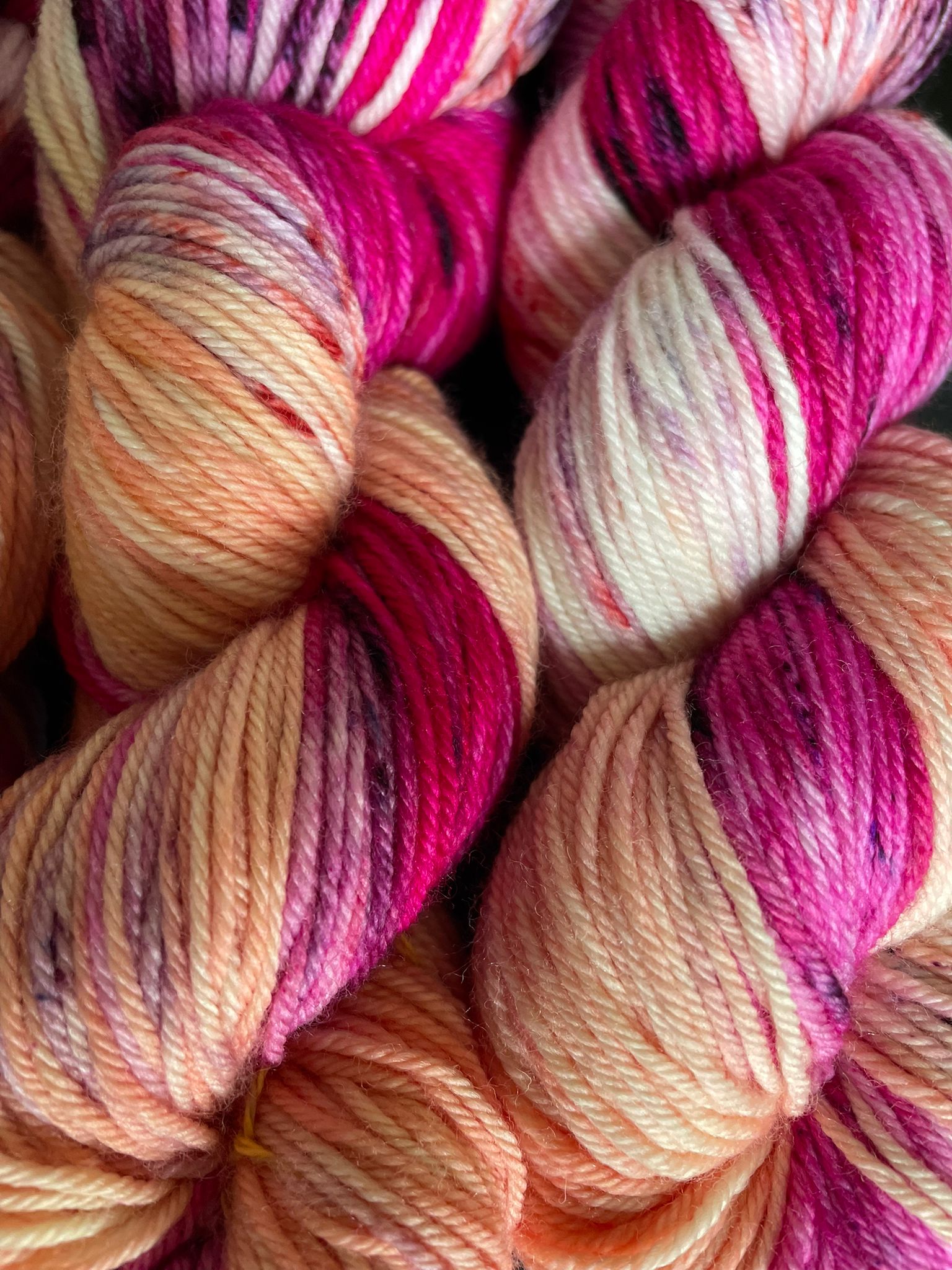Inspired by a decadent raspberry, blackberry and redcurrant pavlova this beautiful dyed yarn includes shades of pink, purple, red and white.