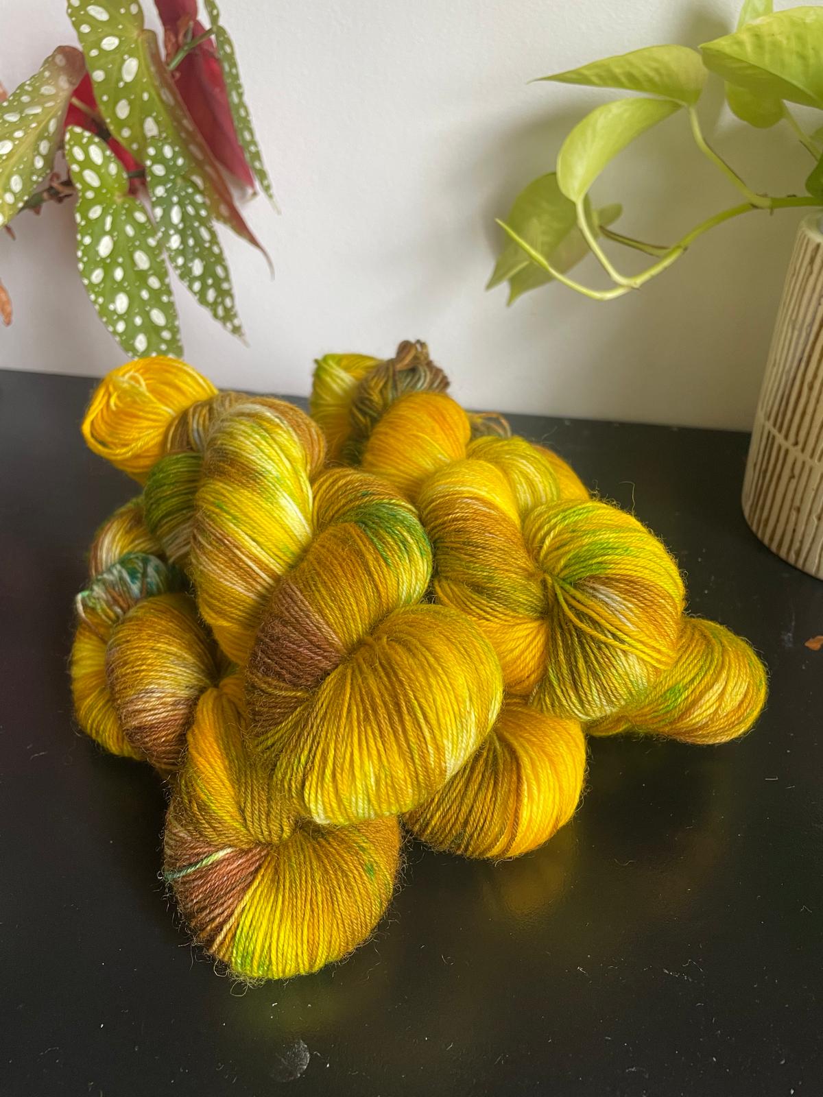 Inspired by those Autumn walks where the leaves have hit the ground this beautiful hand dyed yarn includes shades of brown, yellow, mustard and green