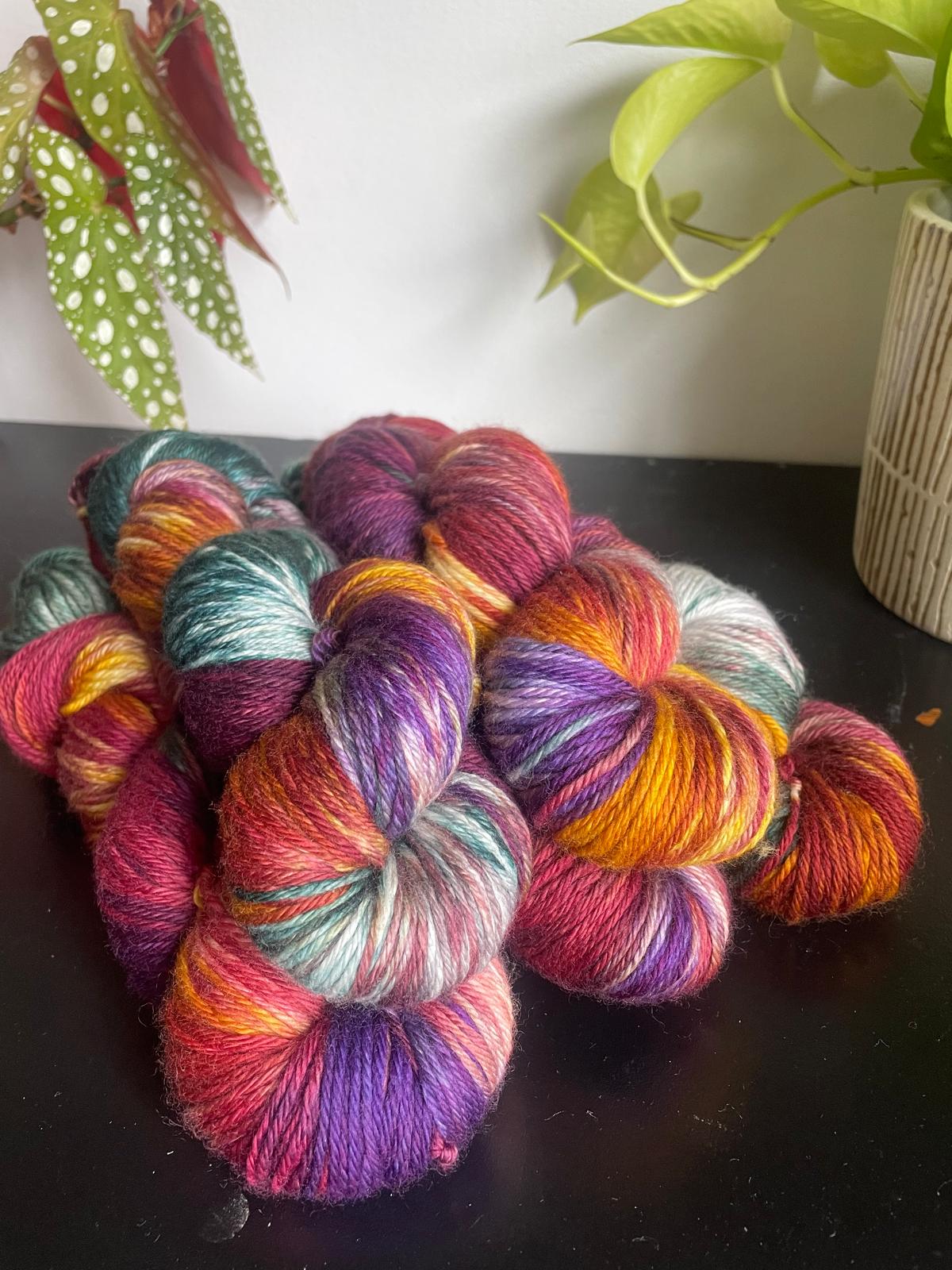 Inspired by the colourful Carolina Duck this beautiful hand dyed yarn includes shades of green, brown, purple, yellow and maroon. This is a wonderfully soft yarn.